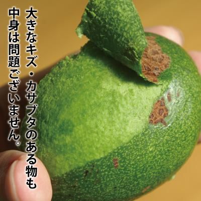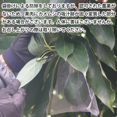 アボカドは現在、使用できる農薬がないため、無農薬栽培となっております。果肉にはカメムシの吸汁跡が固く変質した部分がある場合がございます。人体に害はございませんが、お召し上がりの際は取り除いてください。